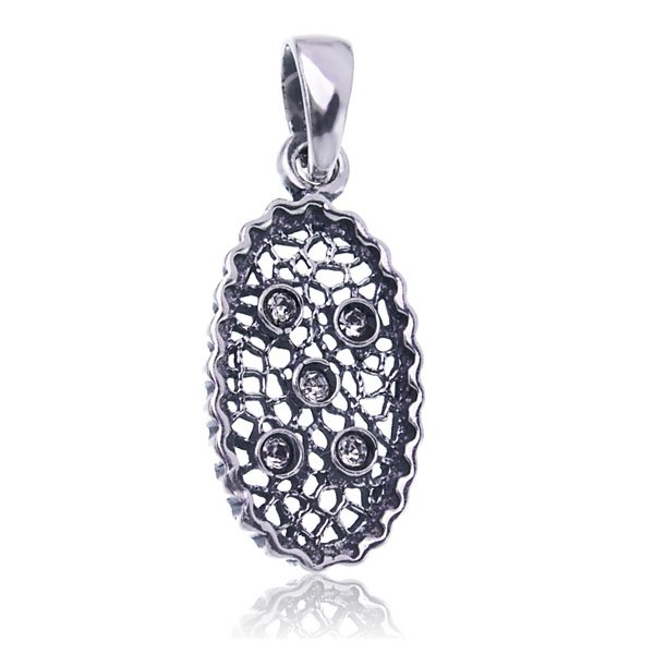 Wisiorek wykonany został z wysokiej jakości oksydowanego srebra próby 925. Ozdobiony 5 białymi dżetami o średnicy 2mm. Wyjątkowy wygląd sprawia, że wisiorek będzie się świetnie prezentowały przy kreacjach codziennych jak i wieczornych. Całkowita długość wisiorka (wraz z przywieszką): 3,2cm, waga: 1,8g.