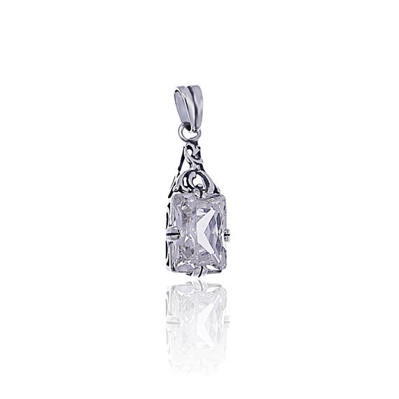 Wisiorek wykonany zostały przy użyciu wysokiej jakości oksydowanego srebra próby 925. Kamień o wymiarach 10x15mm mieni się i odbija światło, został oprawiony w srebrnej ramce, która dodaje wisiorkowi dużego szyku. Całkowita długość wisiorka: ok. 4cm, waga: 5g.