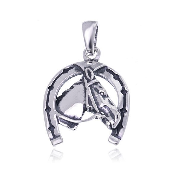 Wysokiej jakości wisiorek do łańcuszka wykonany przy użyciu oksydowanego srebra próby 925. Wisiorek jest jednostronny, przedstawia wizerunek konia i podkowy. Wykonany został z dbałością o szczegóły i detale. Jego całkowita długość (wraz z przywieszką) wynosi ok. 3,2cm, natomiast szerokość ok. 2,2cm.