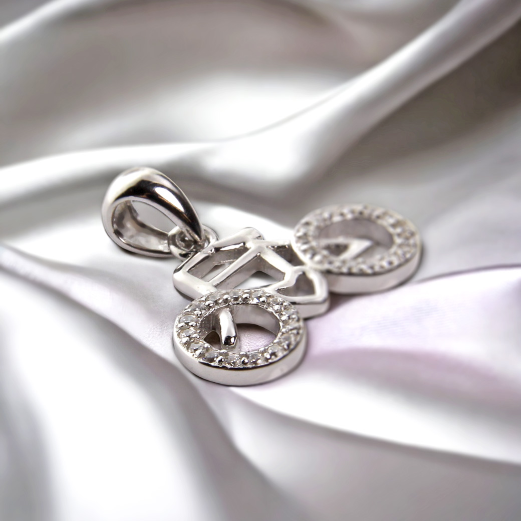 W kształt wisiorka wplecione zostało urokliwe serca. Koła naszego srebrnego roweru wypełnione są białymi pięknie mieniącymi się cyrkoniami.