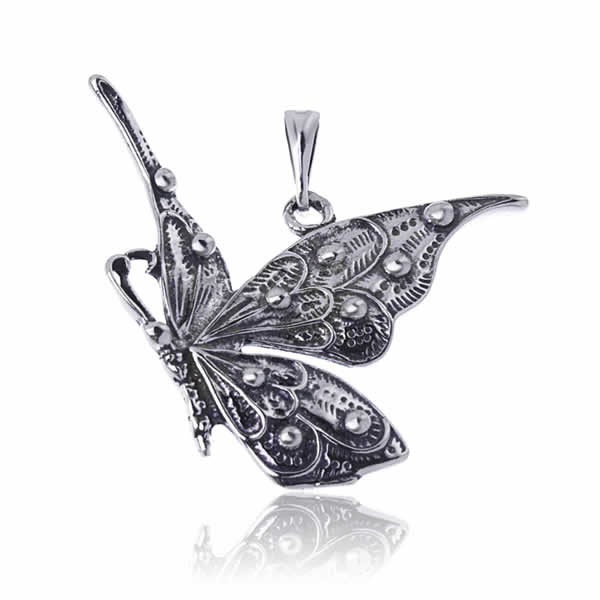 Przedstawiamy Państwu wysokiej jakości wisiorek do łańcuszka wykonany przy użyciu oksydowanego srebra próby 925. Wisiorek jest jednostronny, przedstawia wizerunek pięknego motyla. Wykonany został z dbałością o szczegóły i detale. Jego całkowita długość wynosi ok. 4,2cm, natomiast szerokość (w najszerszym punkcie) 4,2cm. Wysoka jakość wykonania zapewnia trwałość na wiele lat. Wisiorek o wadze 6,6g.
