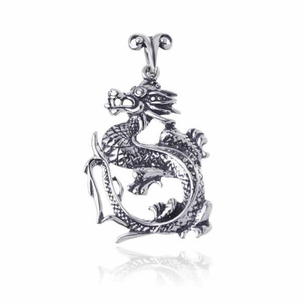 Piękny, bardzo efektowny wisiorek wykonany w całości z oksydowanego srebra próby 925. Wisiorek przedstawia wizerunek smoka mierzącego 4,5cm długości (wraz z przywieszką), 2,6cm szerokości oraz 2,7mm grubości. Jego całkowita waga wynosi 4,9g.