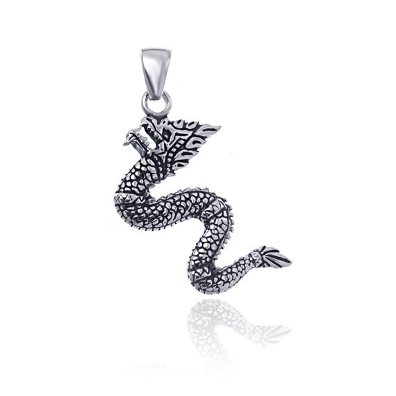 Piękny, bardzo efektowny wisiorek wykonany w całości z oksydowanego srebra próby 925. Wisiorek przedstawia wizerunek smoka mierzącego 4,5cm długości (wraz z przywieszką), 2,3cm szerokości oraz 3mm grubości. Jego całkowita waga wynosi 4,8g.