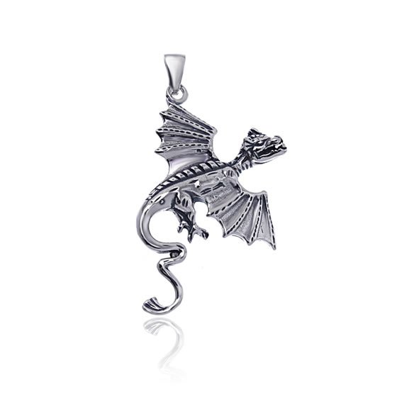 Piękny, bardzo efektowny wisiorek wykonany w całości z oksydowanego srebra próby 925. Wisiorek przedstawia wizerunek smoka z rozłożonymi ramionami, mierzącego 5,4cm długości (wraz z przywieszką), 4,2cm szerokości oraz 5mm grubości. Całkowita waga wisiorka wynosi 8,7g.