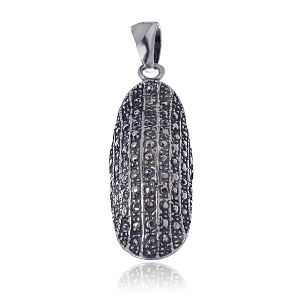 Wykonany został w całości z wysokiej jakości oksydowanego srebra próby 925. Wisiorek jest jednostronny – o wypukłym kształcie. Mierzy 5cm długości, 1,5cm szerokości i 8mm grubości. Całkowita waga wisiorka 6,4g.