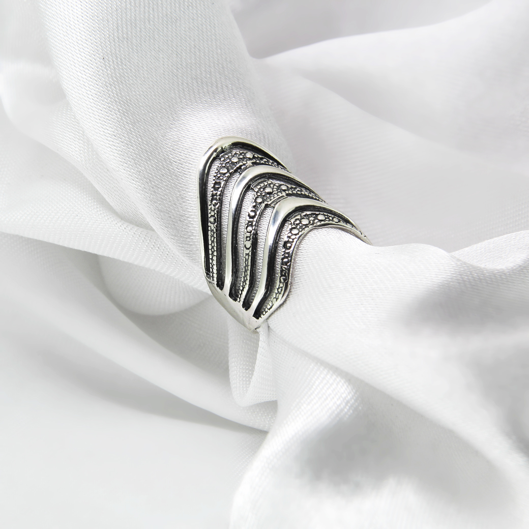 - Pierścionek wysoki, pięknie i oryginalnie zdobi dłoń. Osiąga ponad 2,2 cm długości!